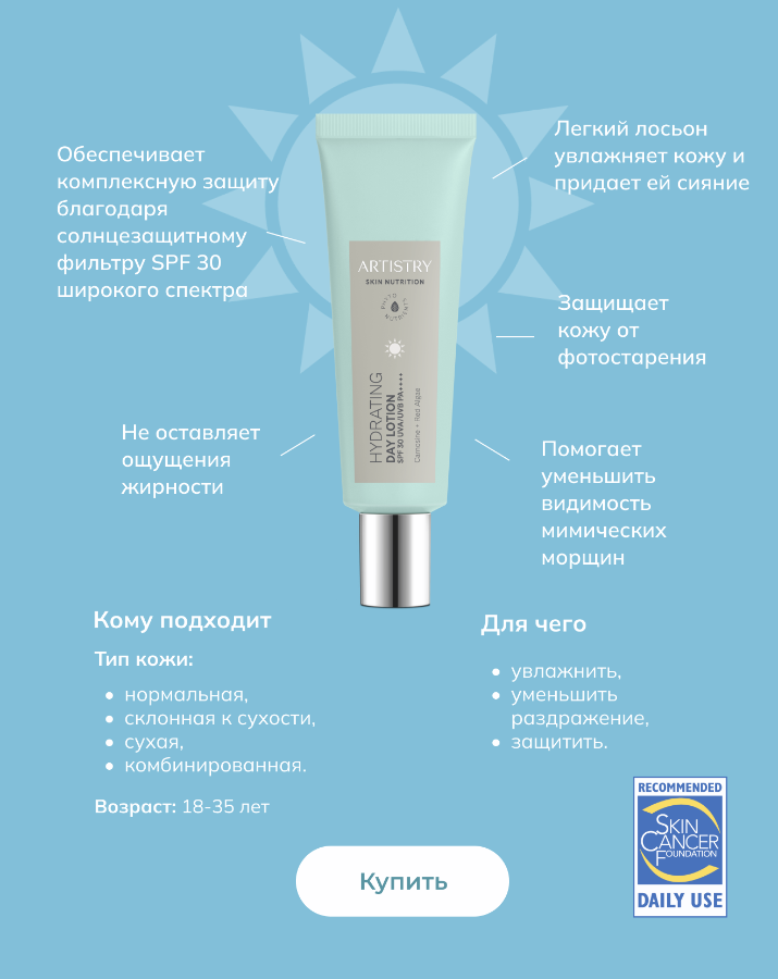 - Обеспечивает комплексную защиту «от всего спектра лучей» благодаря солнцезащитному фильтру SPF 30.
