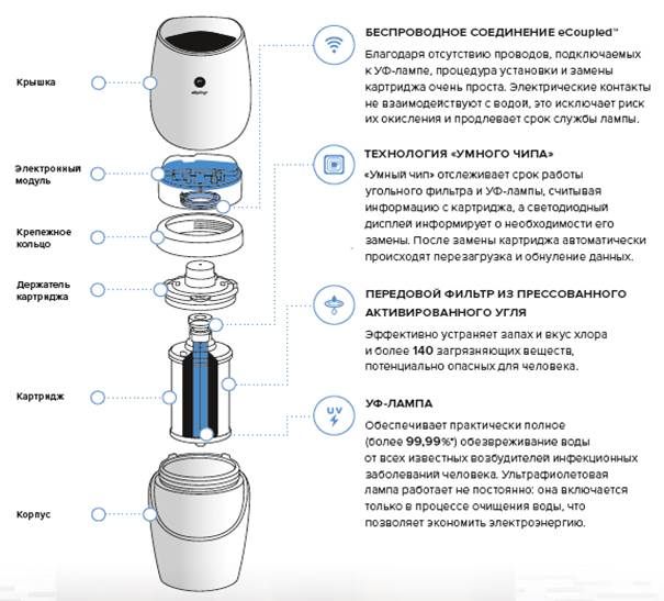 - «Умный чип» отслеживает срок работы угольного фильтра и УФ-лампы, считывая информацию с картриджа. Светодиодный дисплей проинформирует вас о необходимости замены картриджа.