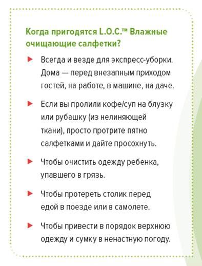 Пропитанные L.O.C. Многофункциональным чистящим средством LOC Влажные очищающие салфетки с легким ароматом свежести предназначены для удаления случайных пятен с поверхностей и изделий, окрашенных стойкими красителями. Бархатистые, мягкие и удобно упакованные в компактный многоразовый пакет салфетки не травмируют кожу рук и безопасны для очищения любых моющихся поверхностей.