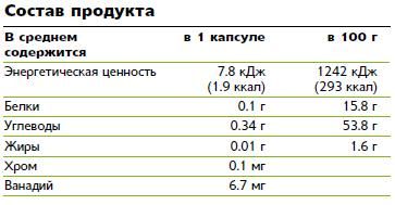 - Является дополнительным источником хрома и ванадия, источником гидроксилимонной кислоты для лиц, контролирующих массу тела.