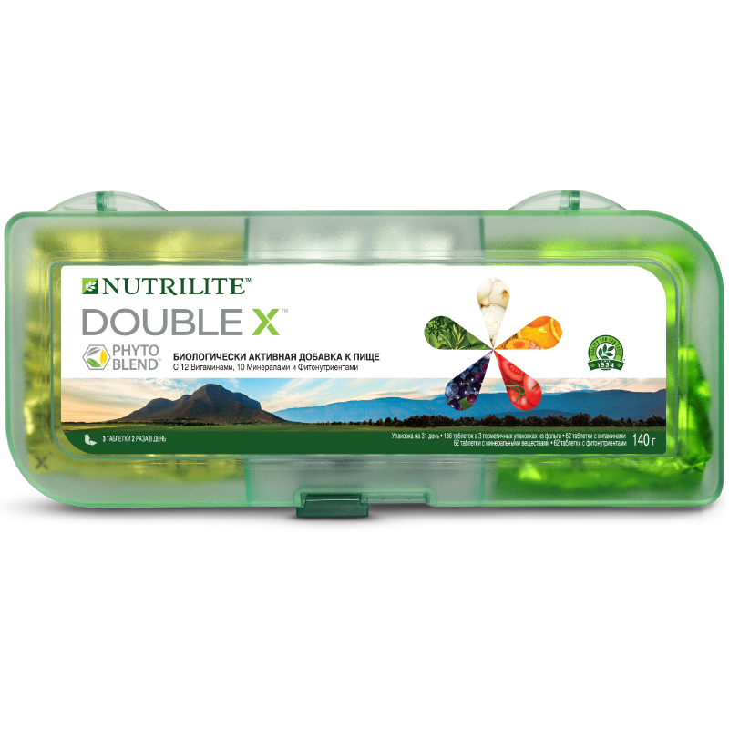 NUTRILITE™ DOUBLE X™ c витаминами, минералами и фитонутриентами - это смесь жизненно важных витаминов, минералов, фитонутриентов. Этот состав был разработан для оказания усиленной поддержки организму, когда он подвержен повышенным нагрузкам и требует больше полезных веществ. Содержит натуральные растительные вещества в концентратах, приготовленных из овощей и растений.
