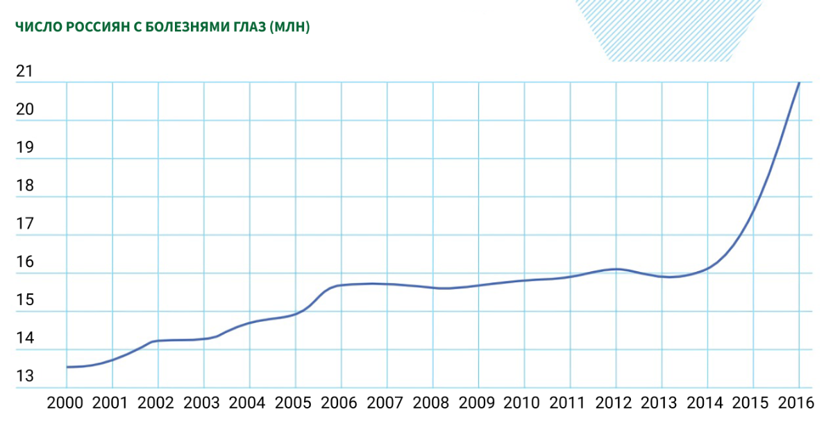 За последние несколько лет существенно выросло число заболеваний глаз, вызванных увеличением времени использования электронных гаджетов, причём доля молодого поколения растёт с каждым годом. Каждый шестой россиянин страдает заболеваниями глаз.