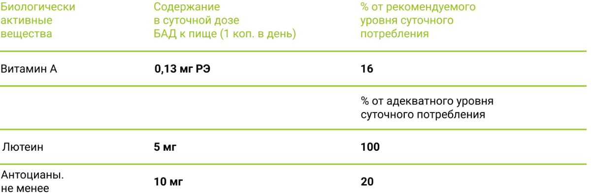 По 1 таблетке в день. Продукт будет полезен всем, кто заботится о здоровье глаз и их зрительной функции, а с учётом роста количества гаджетов - практически всем, кто увлекается цифровыми устройствами, такими как смартфоны, ноутбуки и телевизоры.