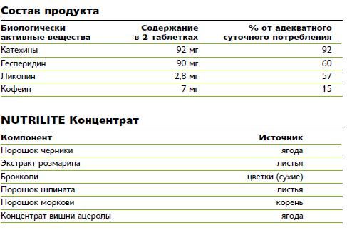 ЭКСТРАКТ ЗЕЛЕНОГО ЧАЯ (CAMELLIA SINENSIS), СТАБИЛИЗАТОР: МИКРОКРИСТАЛЛИЧЕСКАЯ ЦЕЛЛЮЛОЗА; МАЛЬТОДЕКСТРИН, ЭКСТРАКТ ГРАНАТА (PUNICA GRANATUM), ЭКСТРАКТ АПЕЛЬСИНА (CITRUS SINENSIS), СТАБИЛИЗАТОР: КРОСКАРАМЕЛЛОЗА; АНТИСЛЕЖИВАЮЩИЙ АГЕНТ: ЖИРНЫЕ КИСЛОТЫ (СТЕАРИНОВАЯ КИСЛОТА); ЖЕЛАТИН, КУКУРУЗНОЕ МАСЛО, ЭКСТРАКТ РОЗМАРИНА (ROSMARINUS OFFICINALIS), КУКУРУЗНЫЙ КРАХМАЛ, ЭКСТРАКТ БУЗИНЫ (SAMBUCUS NIGRA), ПОРОШОК ВИШНИ АЦЕРОЛЫ (MALPHIGIA PUNICIFOLIA), САХАРОЗА, ПОРОШОК ЧЕРНИКИ (VACCINIUM CORYMBOSUM), ПОРОШОК БРОККОЛИ (BRASSICA OLERACEA), ПОРОШОК МОРКОВИ (DAUCUS CAROTA), ПОРОШОК ШПИНАТА (SPINACEA OLERACEA), АНТИСЛЕЖИВАЮЩИЙ АГЕНТ: ДИОКСИД КРЕМНИЯ; СТАБИЛИЗАТОР: ГИДРОКСИПРОПИЛМЕТИЛЦЕЛЛЮЛОЗА; СТАБИЛИЗАТОР: ГУММИАРАБИК; ЛИКОПИН, ВЛАГОУДЕРЖИВАЮЩИЙ АГЕНТ: ГЛИЦЕРИН; ГЛАЗИРОВАТЕЛЬ: КАРНАУБСКИЙ ВОСК. СОДЕРЖИТ СОЮ.