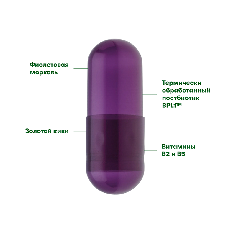 носитель: микрокристаллическая целлюлоза, гидропсипропилметилцеллюлоза, порошок киви (Actinidia chinensis var. chinensis), мальтодекстрин, порошок моркови пурпурной (Daucus carota), антислеживающий агент: диоксид кремния; термообработанные бифидобактерии Bifidobacterium anima subsp. lactis CECT 8145; стабилизатор: стеариновая кислота, D-пантотенат кальция, натуральный краситель: концентрат моркови, рибофлавин.