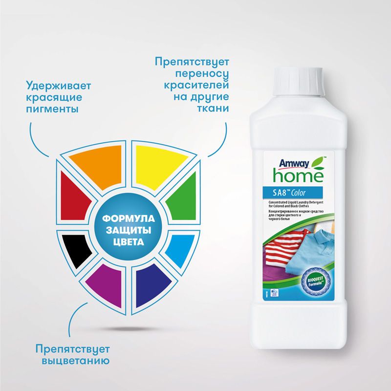 Это средство было разработано специально для стирки цветных и черных тканей. Формула защиты цвета удерживает красящие пигменты внутри ткани, препятствуя выцветанию и переносу красителей на другие вещи.