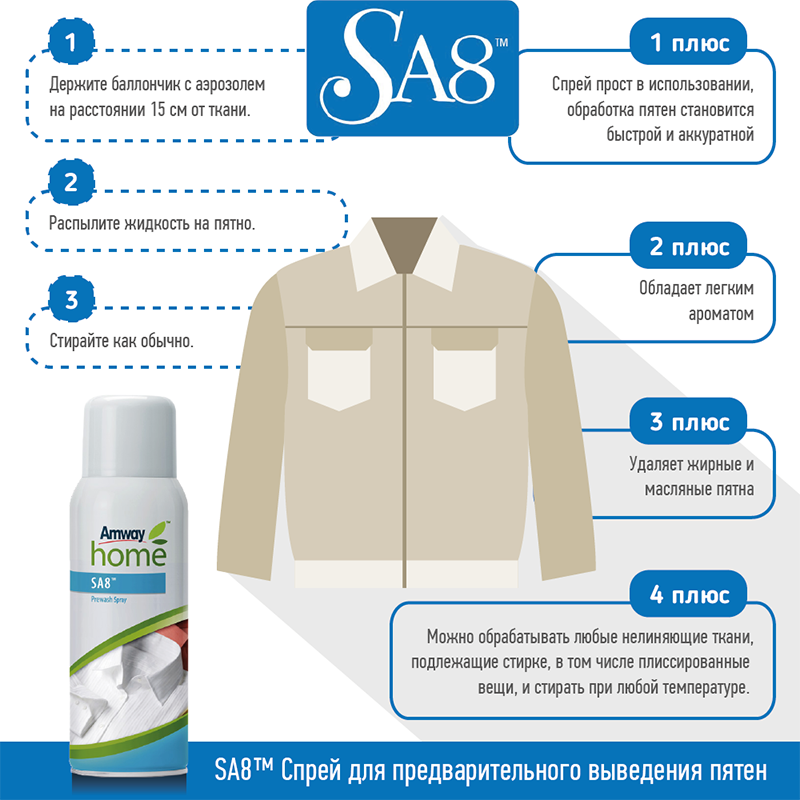 Держите балончик с аэрозолем на расстоянии 15 см от ткани и распылите жидкость прямо на пятно. Стирайте как обычно. Чем раньше Вы обработаете пятно, тем лучше будет результат.